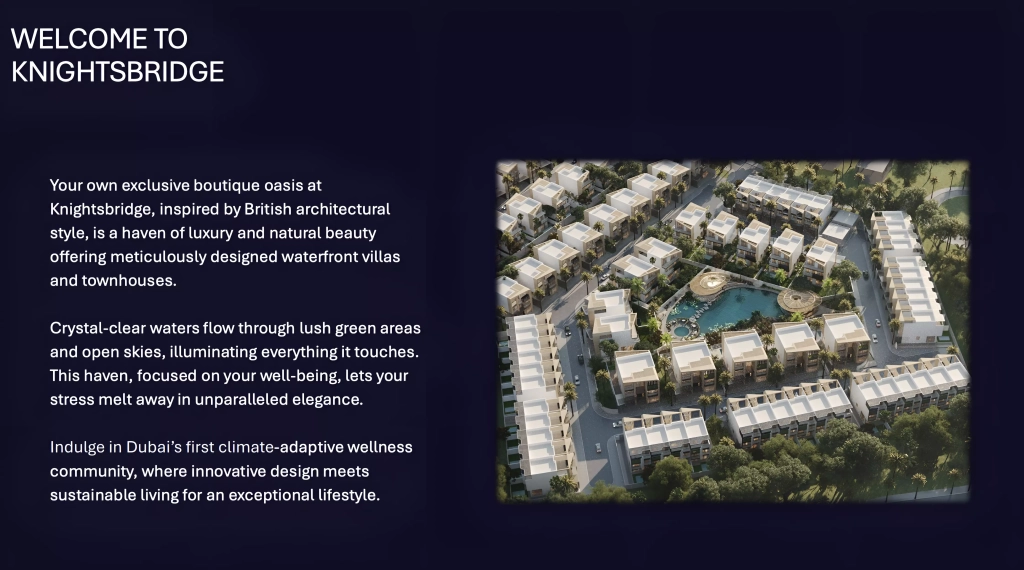 Knightsbridge at Meydan District 11 stands as Dubai’s first climate-adaptive residential development by LEOS International. This groundbreaking project redefines opulence with a visionary approach to climate-adaptive design where luxury living meets environmental consciousness. Offering a range of 4-bedroom townhouses and 5 & 6-bedroom villas, Knightsbridge seamlessly blends British architectural elegance with cutting-edge technology, presenting an unrivaled living experience.